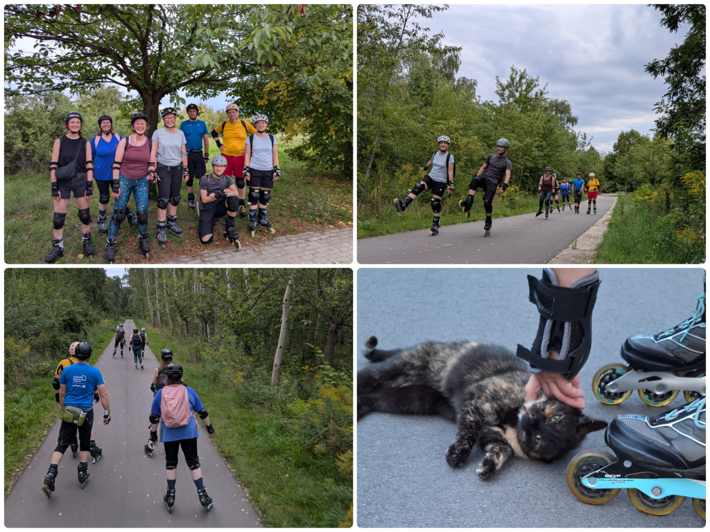 Noch fehlten uns an dieser Stelle ein paar Kilometer bis zur 30, deshalb entschieden wir uns, die Strecke Richtung Bahnhof in Luckenwalde doch noch auf Skates zu bestreiten. An diesem Ostersonntag waren wir eine gemütliche Gruppe gewesen, vier Skater*innen inklusive Trainer. Den hatten wir dank Johannas Karottenkuchen, den wir vor Ort mit Marzipankarotten verzierten, noch motivieren können. Denn das Anmeldeverhalten für den Ausflug war wieder einmal etwas zäh gewesen.