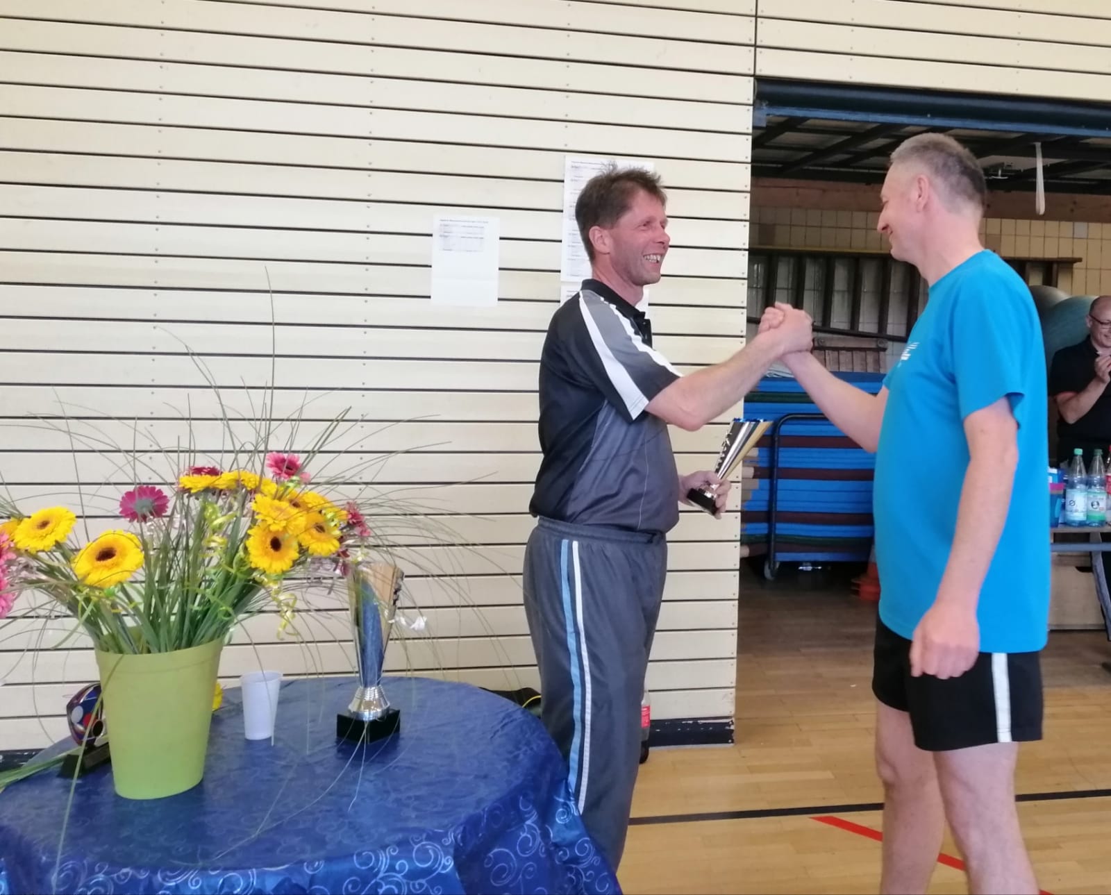 Im Duell der Doppelpartner gewann Hendrik den ersten Satz als Andy noch nicht richtig ins Spiel kam. Der zweite Satz ging nach Verlängerung an Hendrik. Aber Andy kommt immer zurück!!! So ging Satz 3 an ihn, bevor Hendrik im vierten Satz bei 9:9 als Glücksritter himself einen Netzball für sich hatte und Andy anschließend eine Schupfball nicht traf. Der Sieg von Hendrik passte in die ausgeglichene Bilanz aus den Spielen der letzten Jahre. Bis 2015 war Andy immer siegreich bei Vereinsmeisterschaften. 2015 gewann Hendrik erstmals im Finale. 2017 ging der Sieg im Viertelfinale im 5. Satz mit 16:14 nach einem Kantenball an Andy.